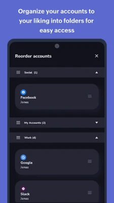 تتجاوز تجربة OneAuth مجرد الأمان لتقدم لك تحكماً وتنظيماً فائقين. استمتع بمزامنة رموز OTP السرية الخاصة بك عبر جميع أجهزتك، بما في ذلك دعم أجهزة Android وWear OS، لتتمكن من الوصول إلى حساباتك من أي مكان وفي أي وقت. خصص مساحتك الرقمية بإنشاء مجلدات لتصنيف حسابات المصادقة الخاصة بك، وتمييزها بشعارات علاماتها التجارية لتحديد أسرع. ومع ميزات مثل اختصارات التطبيق والوضع الليلي المريح للعين، بالإضافة إلى إمكانية البحث الفوري، يصبح إدارة أمانك الرقمي تجربة سلسة وممتعة.