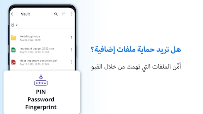 هل تتطلع إلى ملاذ آمن حيث تظل خصوصيتك الرقمية مصونة تمامًا؟ يقدم لك File Commander الحل الأمثل عبر ميزة "المخزن" الفريدة، التي تحوّل ملفاتك الأكثر حساسية—صورك الشخصية، مقاطع الفيديو الخاصة، ووثائقك الهامة—إلى حصن منيع. باستخدام أساليب حماية متطورة تشمل رمز المرور، بصمة الإصبع، أو كلمة سر، يضمن المخزن أن تظل معلوماتك سرية تمامًا وبعيدة عن أي أعين متطفلة. إنه ملاذك الوحيد، مصمم بمنهجية التشفير ذي المعرفة الصفرية من MobiSystems، ليمنحك راحة البال التامة بأن كل ما يخصك يبقى ملكك وحدك.