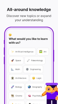 افتح آفاقًا جديدة للمعرفة المتنوعة مع Nibble، وكن الشخص الأكثر إلهامًا في أي مكان تتواجد فيه بفضل إلمامك بمجموعة واسعة من المواضيع. تشمل مكتبة Nibble الواسعة حقولًا معرفية غنية تغطي الفن، الرياضيات، المنطق، التاريخ، الإحصاء، التمويل الشخصي، الفلسفة، علم الأحياء، علم النفس، الأدب، فهم الذكاء الاصطناعي، السينما، الطبخ، الموسيقى، والمزيد. كل درس مصاغ بأسلوب شيق وسهل المتابعة، يضمن لك الاستفادة القصوى وتطبيق ما تتعلمه في الواقع، مما يجعلك أكثر ثقة وقدرة على مشاركة أفكارك.